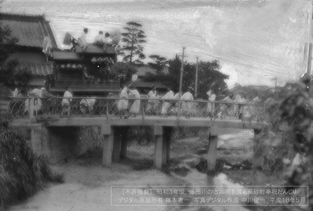第3回も、前回・前々回に続いて、昭和3年(1928年)撮影のだんじりです。 下の写真は、大和高田市・藤本憲一さん原所有のガラス乾板を中川俊一さんが管理委託・デジタル化されたもので、 今回お二方からのご許可を得て掲載させていただいております。 ※このページの写真は所有管理者の方から「不許複製」を条件に展示許可が出ていますので、 無断でコピーならびに加工・転載は一切なさらないようお願いいたします※ |